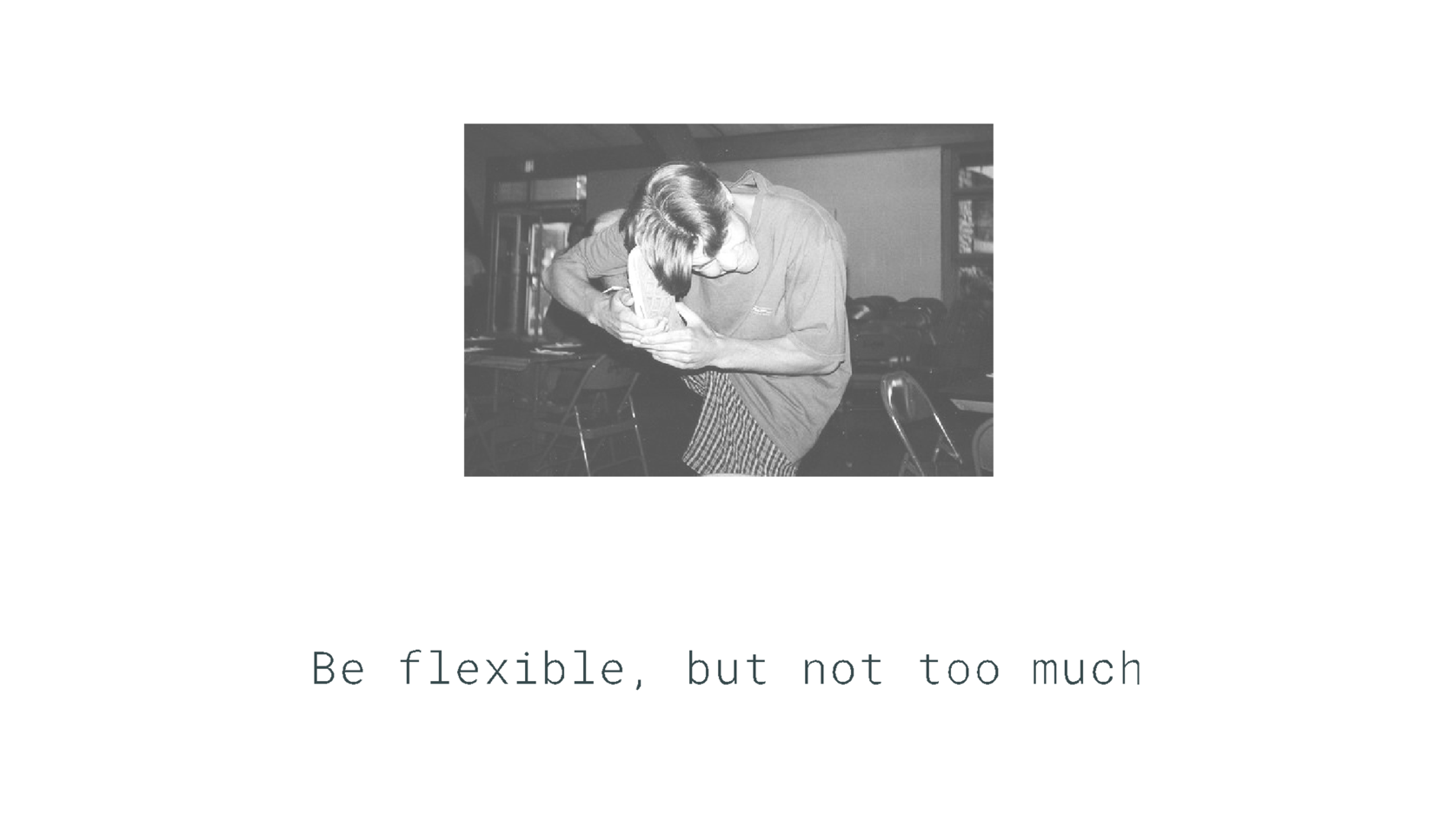 Be flexible, but not too flexible. If someone has a time-machine in the audience please let me address my last thought to myself in the beginning of this journey - it is cool to be flexible, but when you are too flexible you will have to deal with this light-mindedness in the future.